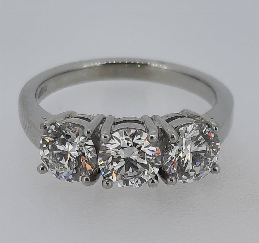 This is a 3 stone platinum ring set with 3 lab grown diamonds